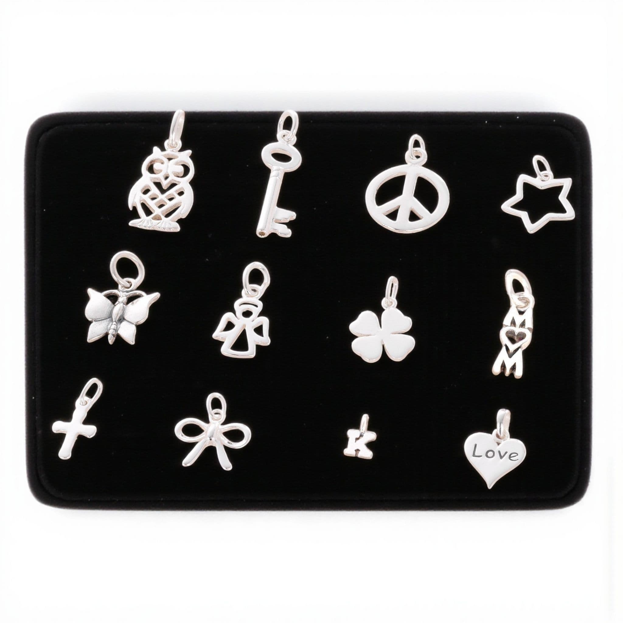 Charm Choice: Key, Owl, Bow, Butterfly, Love Heart, Initial / Letter, cross, star, clover, open angel, Peace Symbol, Mum (m heart m)... along with any birthstone of your choice.