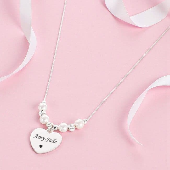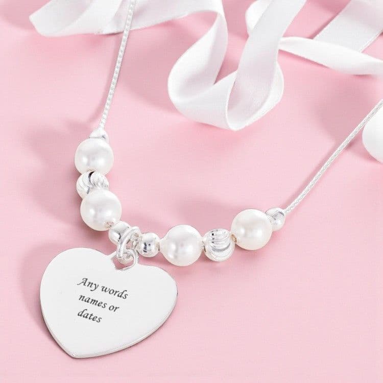 Engraved Sterling Silver Heart Necklace with Pearls & Silver Beads.