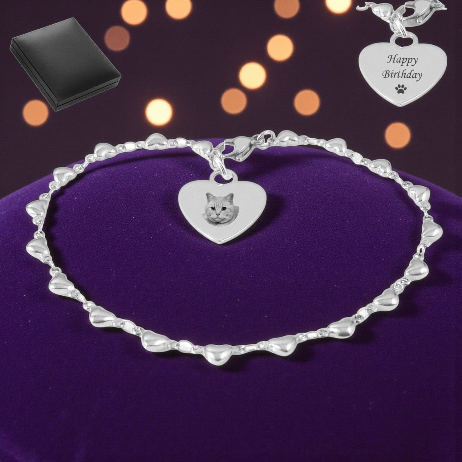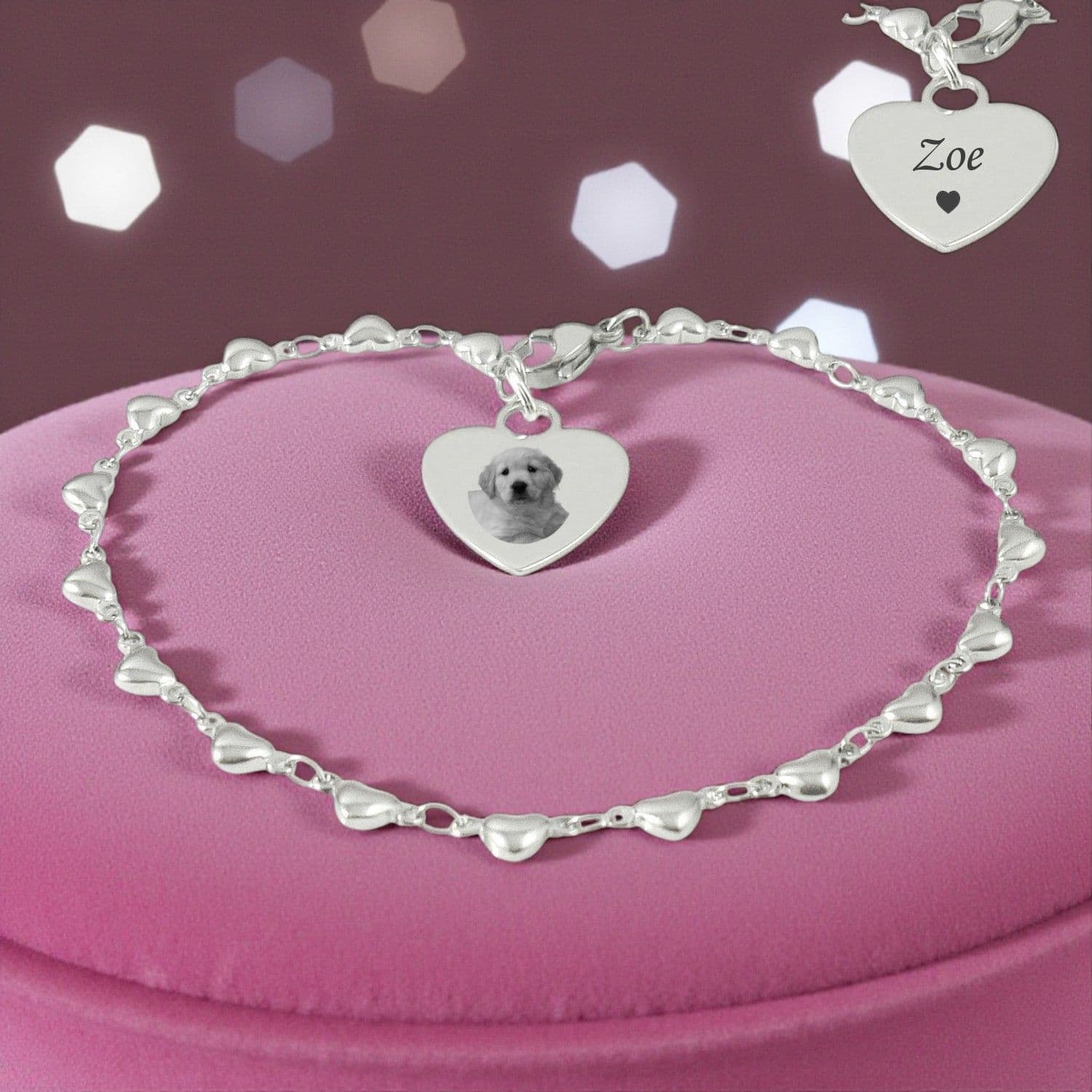 Beautifully engraved, personalised photo engraved heart bracelet for a woman or girl. Made with delicate heart link chain and your choice of any engraving on the heart charm.