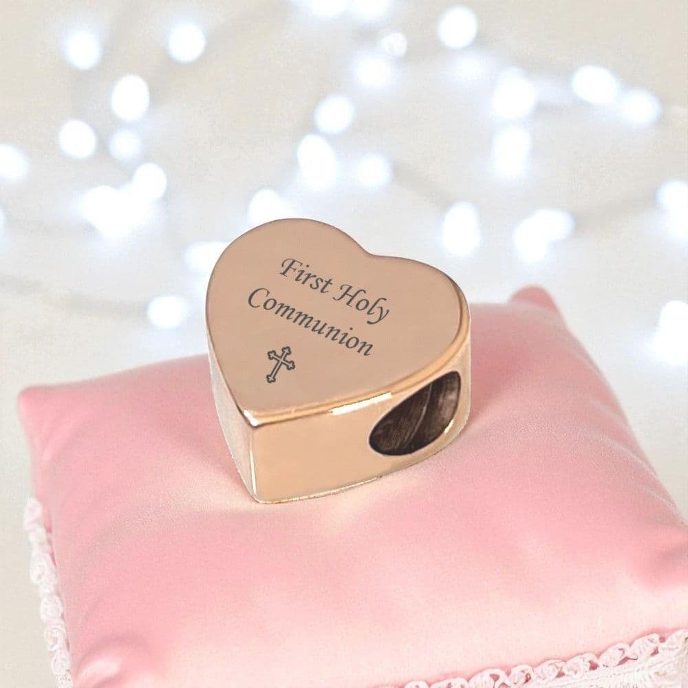 Rose Gold Heart Charm Bead Engraved for First Holy Communion.