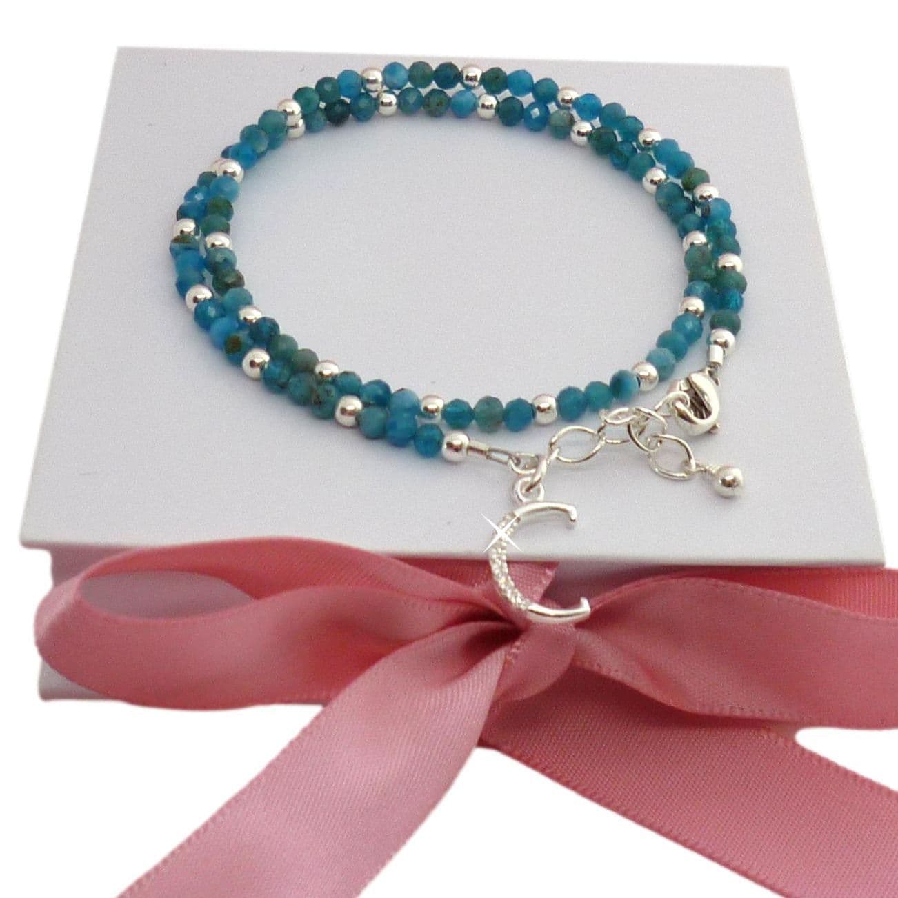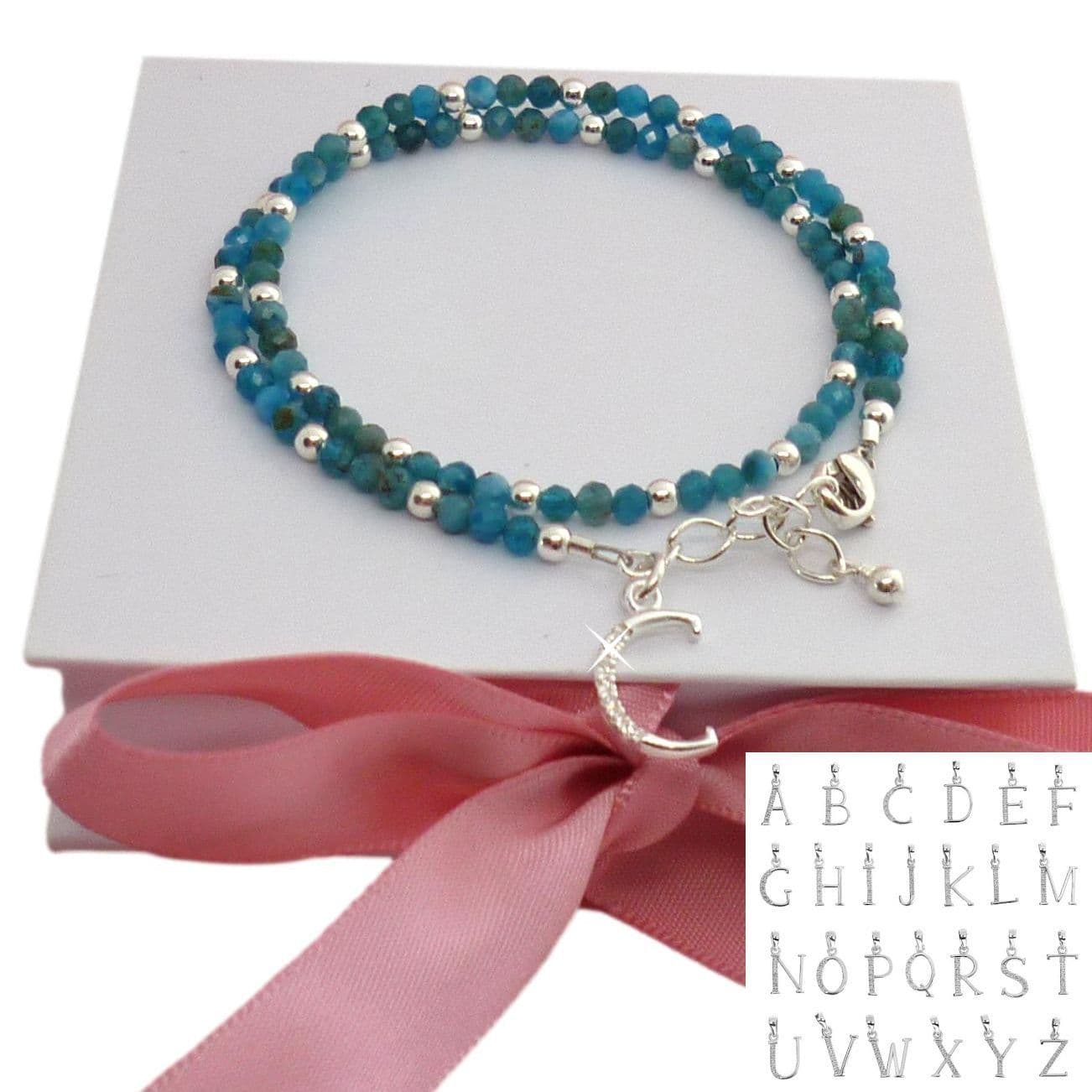 Handcrafted with turquoise semi-precious apatite gemstones interspersed with Sterling silver round beads.