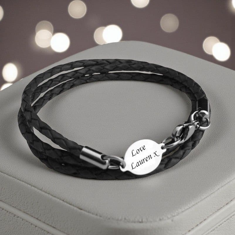 Stylish plaited leather cord bracelet with free engraving on the oval.