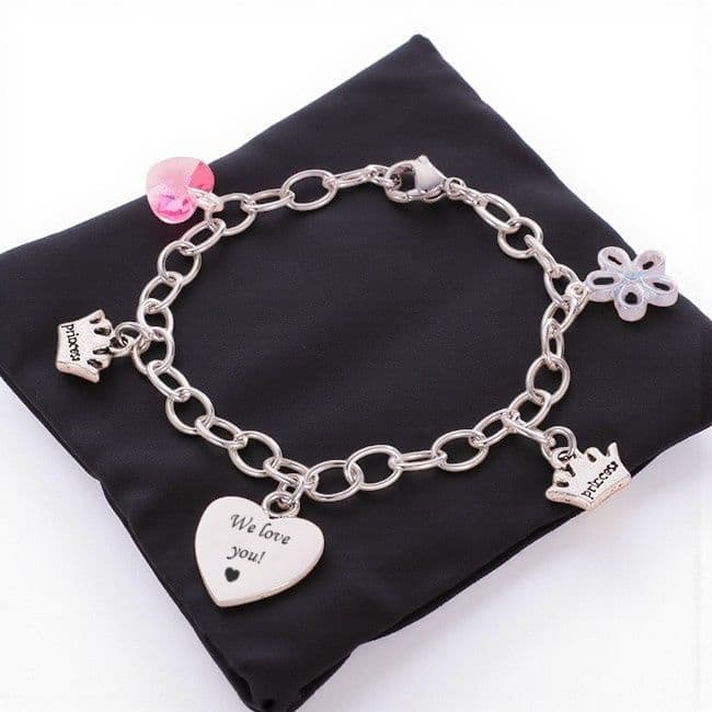 Stainless Steel Engraved Heart Bracelet with Birthstone Heart and Princess Crown Charms.