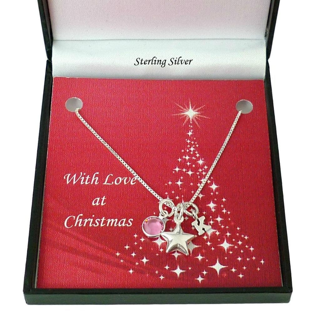 A delicate necklace with a Sterling silver star hanging alongside a birthstone channel and a little sterling silver letter charm of your choice.