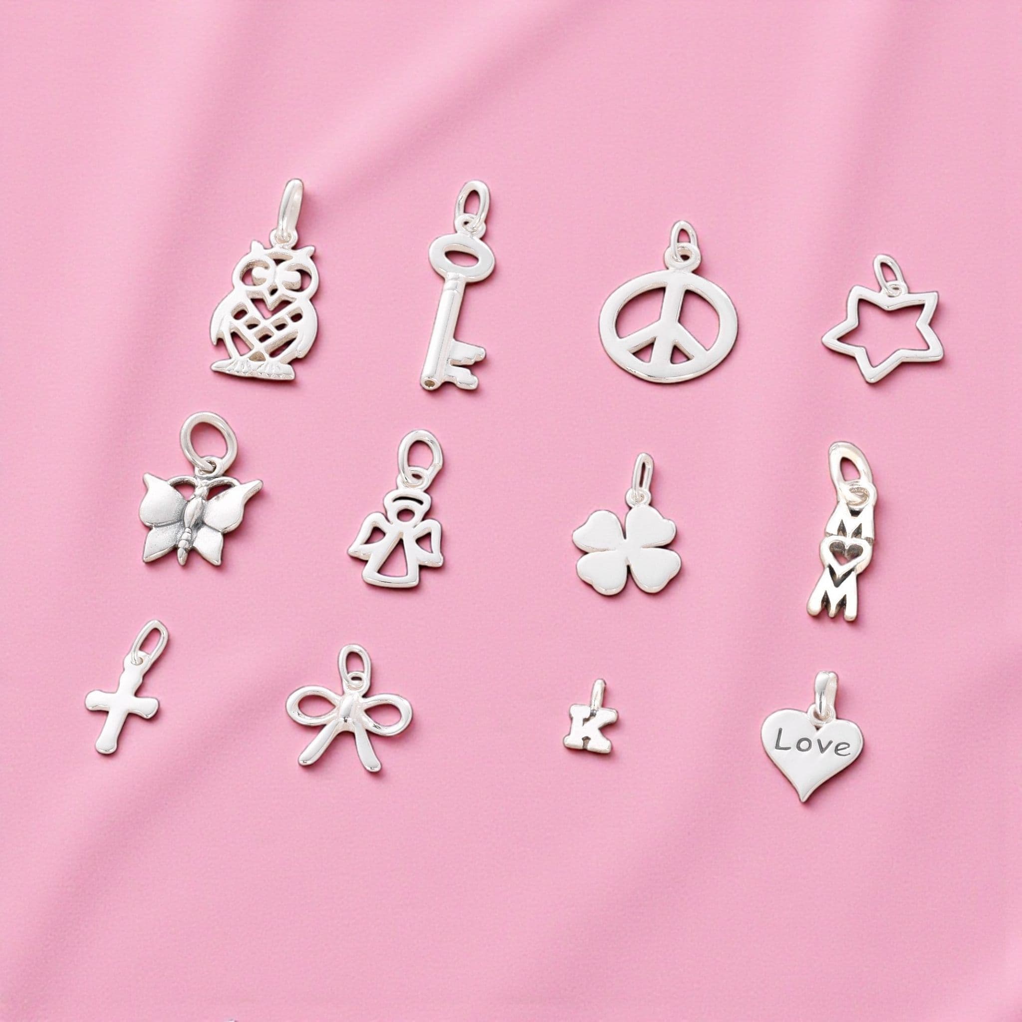 Silver Charm Choice: Key, Owl, Bow, Butterfly, Love Heart, Initial / Letter, initial, cross, star, clover, open angel, Peace Symbol, Mum (m heart m).