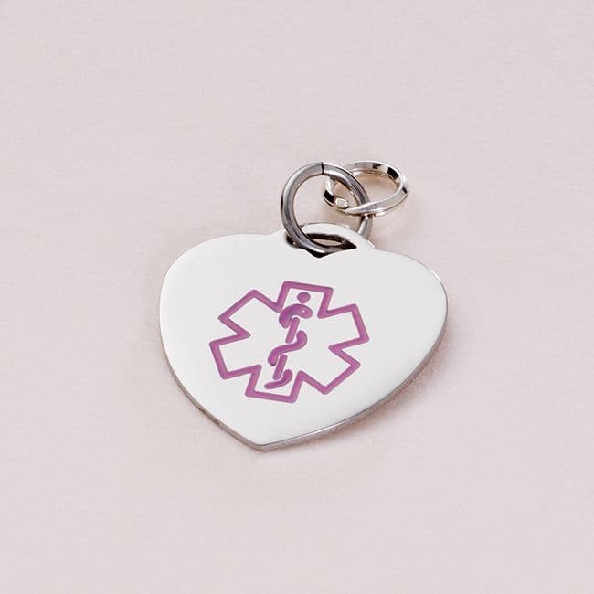 Smaller Medical ID SOS Heart Pendant with Free Engraving and Symbol in Pink.