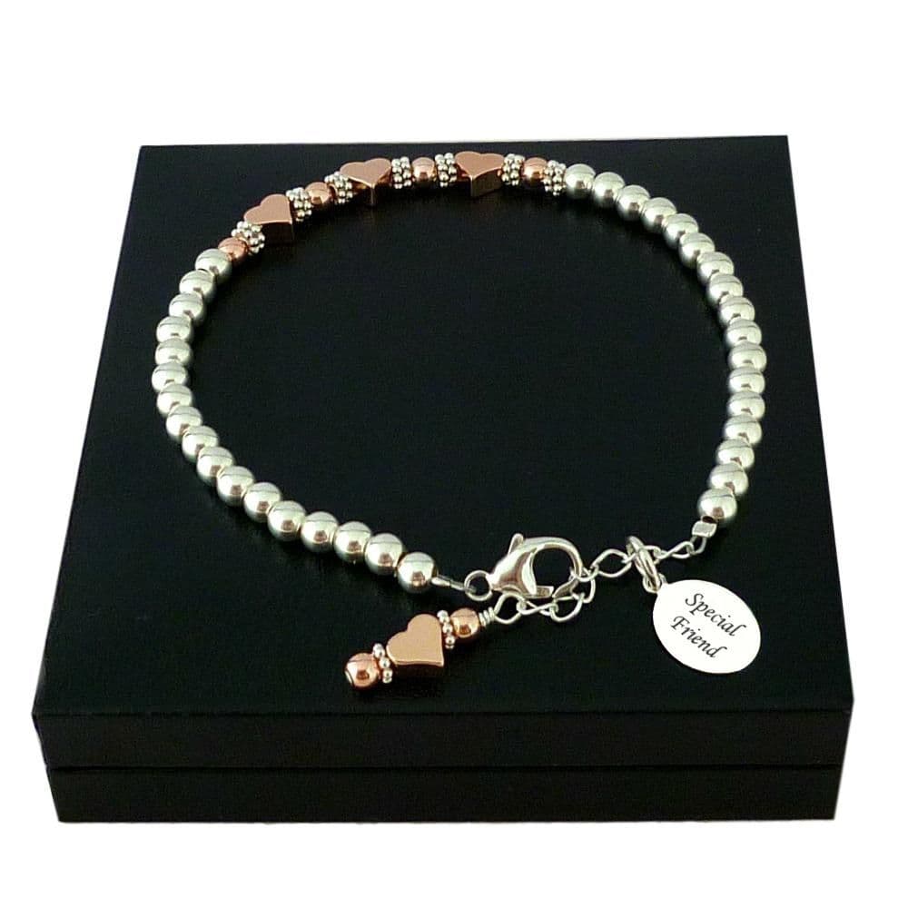 This bracelet, which is part of our range of Engraved Bracelets for Women, is a very high quality bracelet made from .925 Sterling silver, 4mm round beads featuring high quality, rose gold hematite heart shaped beads.